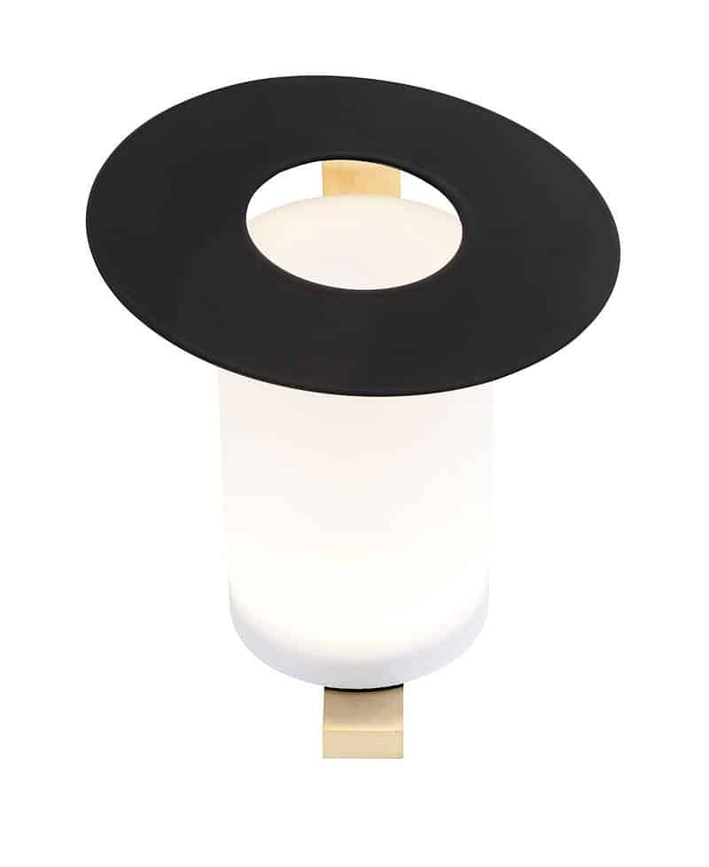 Materials: structure in galvanized steel with brushed gold finish, top with two layer gold coated metal and polished metal in black, porpora or light grey color, rechargeable battery LED Lamp in PMMA. Battery life over 4-6 hours. 10 hours charging time.